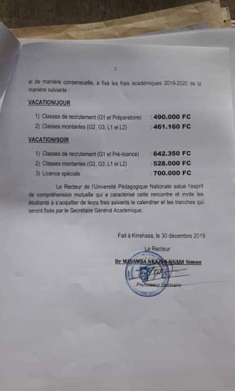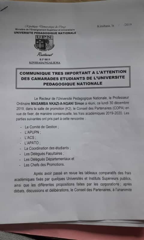 Pour les classes de recrutement (G1 et préparatoires) par exemple, les frais sont passés de 350 000 FC à 490 000 FC. Cette décision a été prise en consensus en conseil des partenaires tenu le 30 décembre dernier. Ci-dessous le communiqué du recteur de l’UPN, le professeur ordinaire Masamba Nkanzi-A-Ngani :