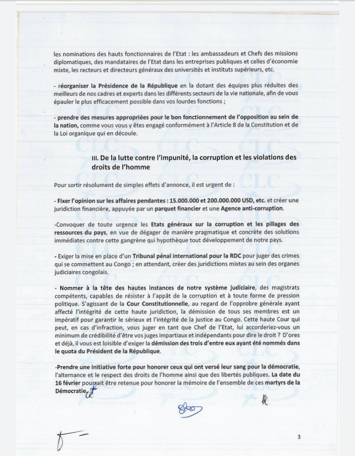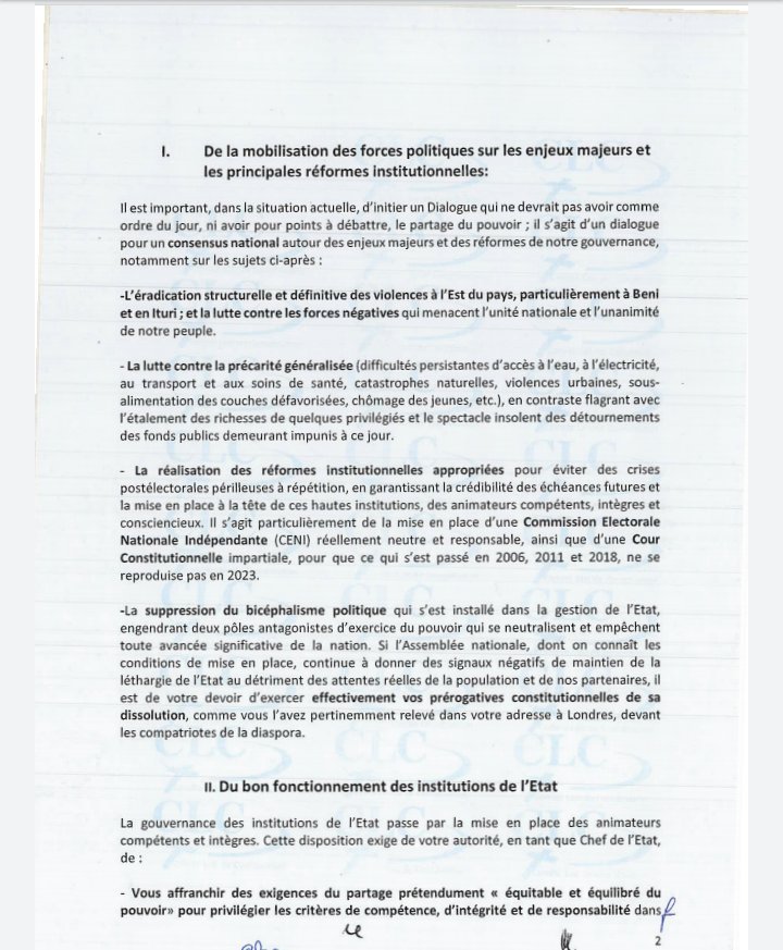Il s’agit notamment de « l’éradication définitive des violences à l’est, la réalisation des réformes institutionnelles, ou encore la suppression du bicéphalisme politique« , lit-on dans la lettre.