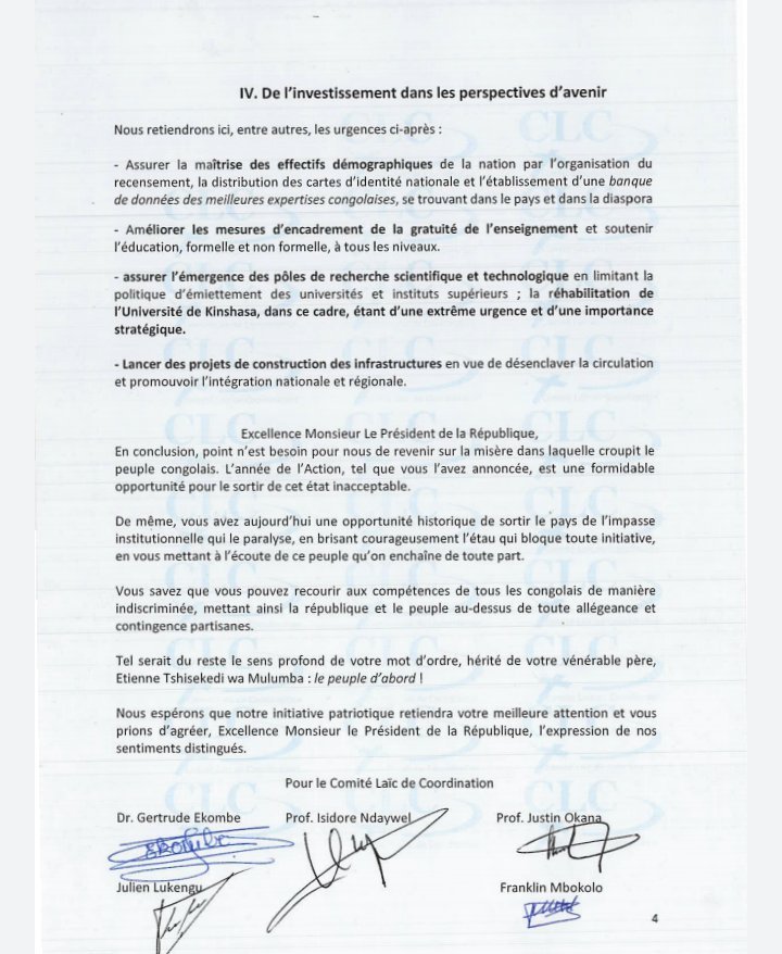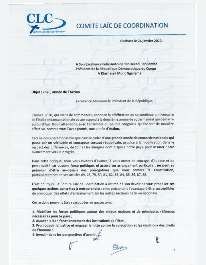 Dans une lettre ouverte adressée au Chef de l’État, Félix Tshisekedi et parvenue à notre rédaction ce vendredi 25 janvier, le Comité Laïc de Coordinnation (CLC) dresse une liste de quelques actions concrètes à entreprendre par le Président de la République au cours de cette année 2020.
