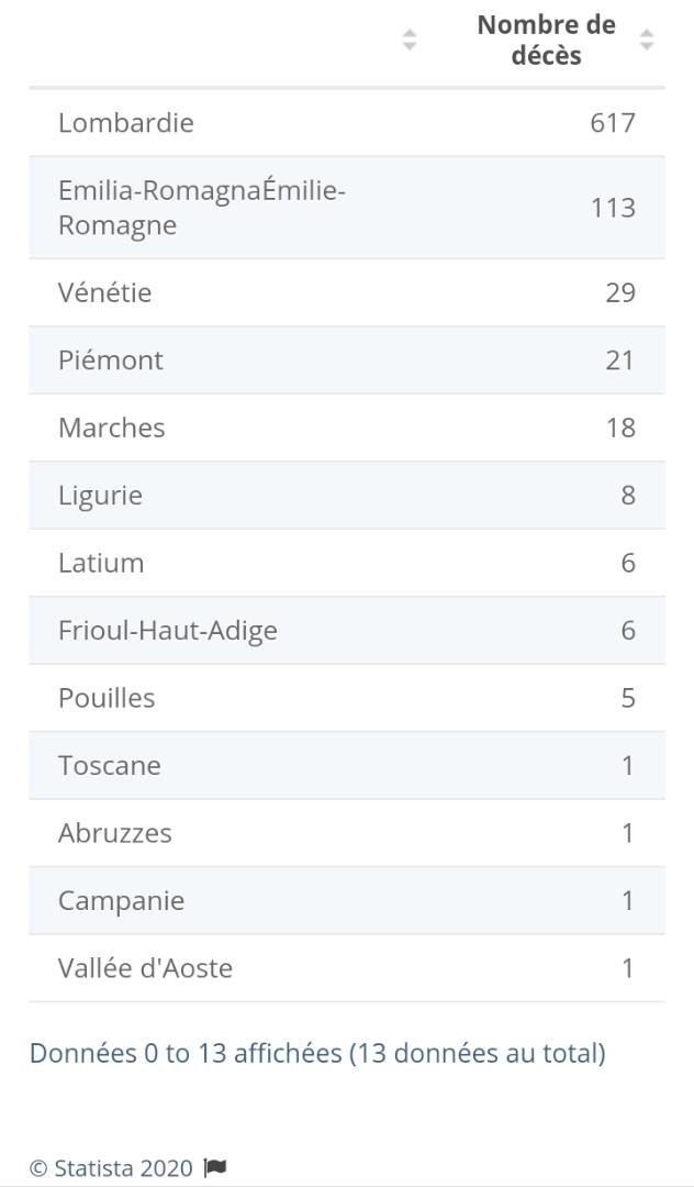 Voici les statistiques des personnes décédées des suites du coronavirus COVID-19 en Italie au 11 mars 2020, selon la région :