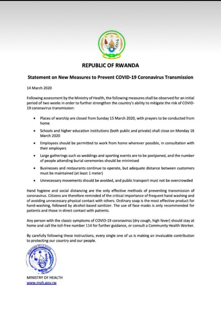 Quelque heures après cette annonce, le ministère de la Santé du Rwanda a pris certaines mesures pour empêcher la propagation de cette maladie, notamment les églises, les écoles, les universités, les compétions sportives, les cérémonies qui peuvent rassembler beaucoup de gens seront fermées à partir de ce dimanche 15 mars 2020.