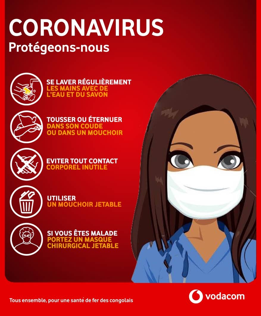 Vodacom Congo, en accord avec les recommandations du Gouvernement, vous encourage a respecter les mesures d’hygiène ci-après afin de protéger nos communautés et de stopper la propagation du Coronavirus.