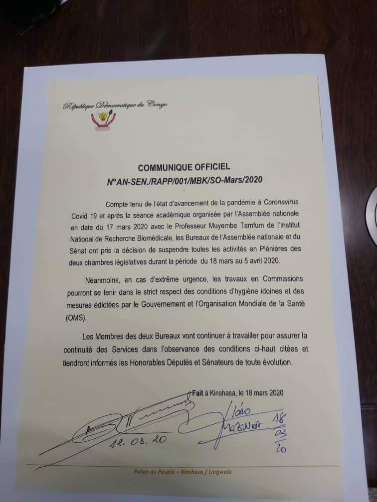 Les deux chambres du parlement congolais, le Sénat et l’Assemblée nationale, ont décidé de la suspension de toutes les activités en plénière, pendant la période allant du 15 mars au 05 avril de l’année en cours. C’est ce qui ressort d’un communiqué publié ce mercredi 18 mars et signé par les deux chambres.