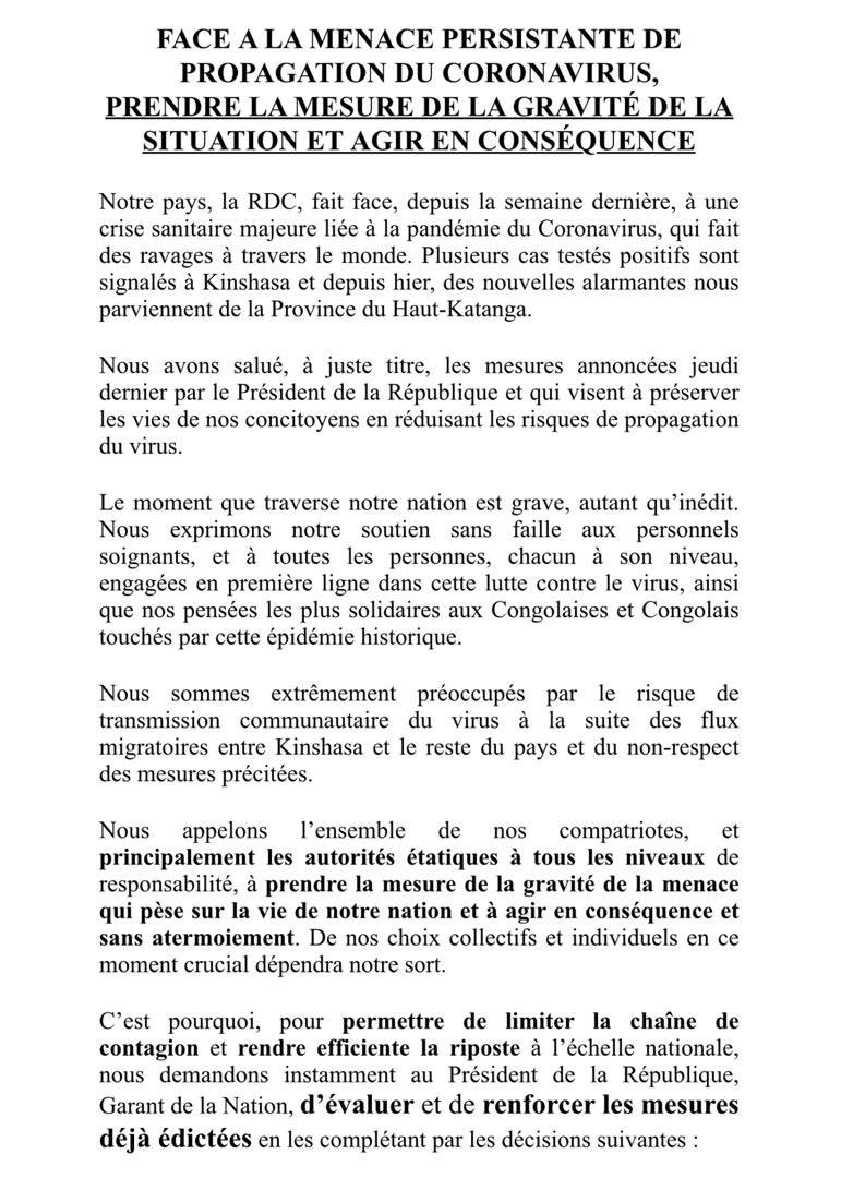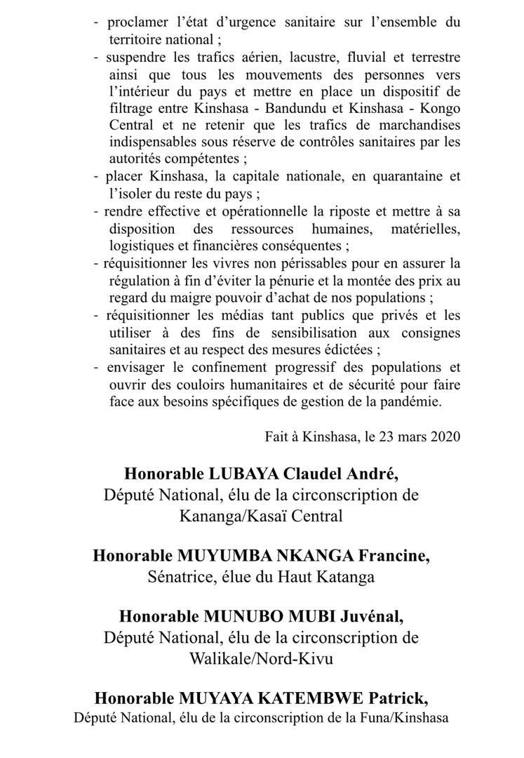 Composé des députés nationaux et sénateur, ce groupe des parlementaires suggère dans un premier temps la mise en quarantaine de la ville de Kinshasa, en vue de prévenir la propagation du virus dans d’autres provinces, à envisager le confinement progressif des populations et ouvrir des couloirs humanitaires et de sécurité pour faire face aux besoins spécifiques de gestion de la pandémie.