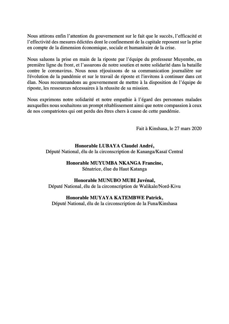 D’après Francine Muyumba (sénatrice), Claudel Lubaya, Juvénal Munubo et Patrick Muyaya (tous trois députés nationaux, ndlr), eu relatif aux mesures prises, « la population a l’impression que le gouvernement lui fait porter toute la charge de la crise et elle en est inquiète ».