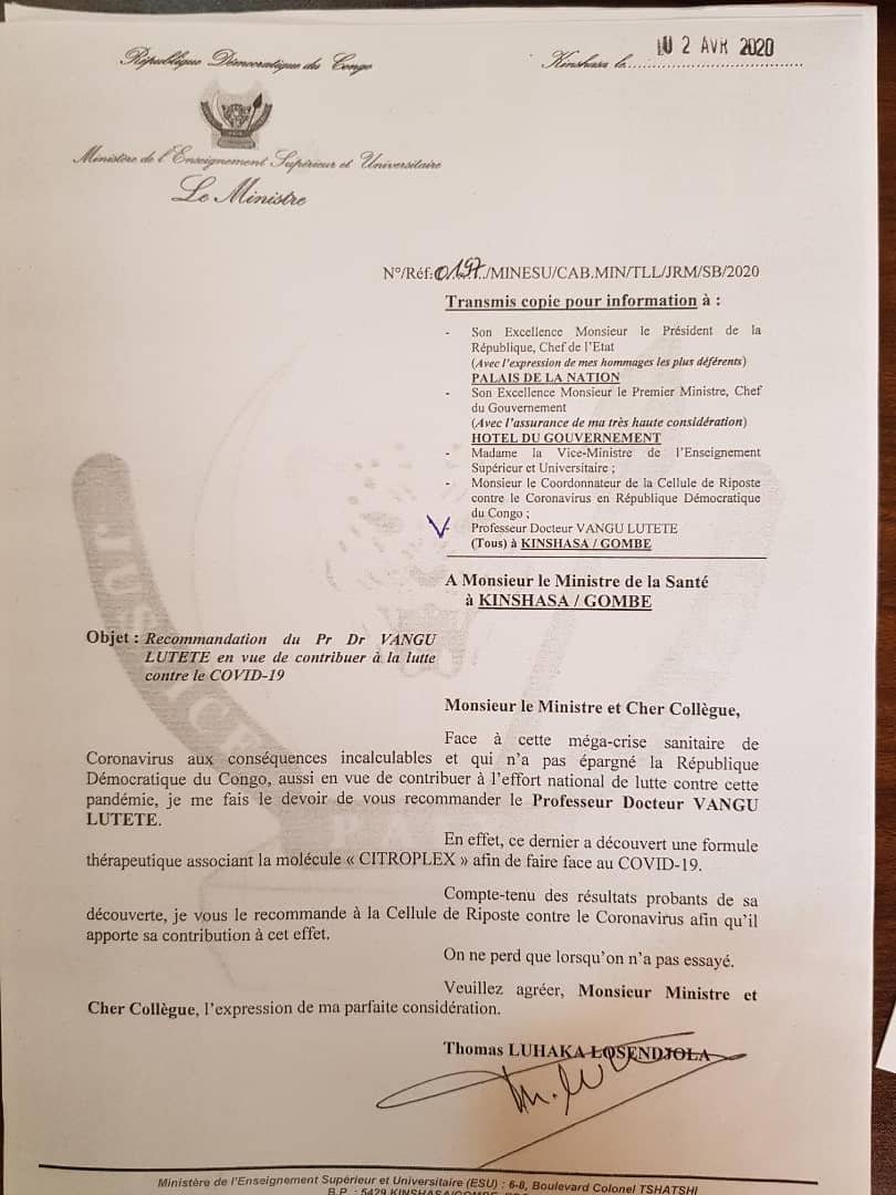 Le ministre de l’Enseignement supérieur et universitaire, Thomas Luhaka, a dans une correspondance adressée à son homologue de la santé, recommandé le Professeur Dr Vangu Lutete, afin que ce dernier soit utilisé dans la lutte contre cette pandémie.