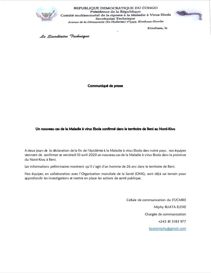 Alors que l’on s’approchait à la déclaration de la fin d’Ebola en République démocratique du Congo, un cas vient d’être confirmé ce vendredi 10 avril à Beni au Nord-Kivu.