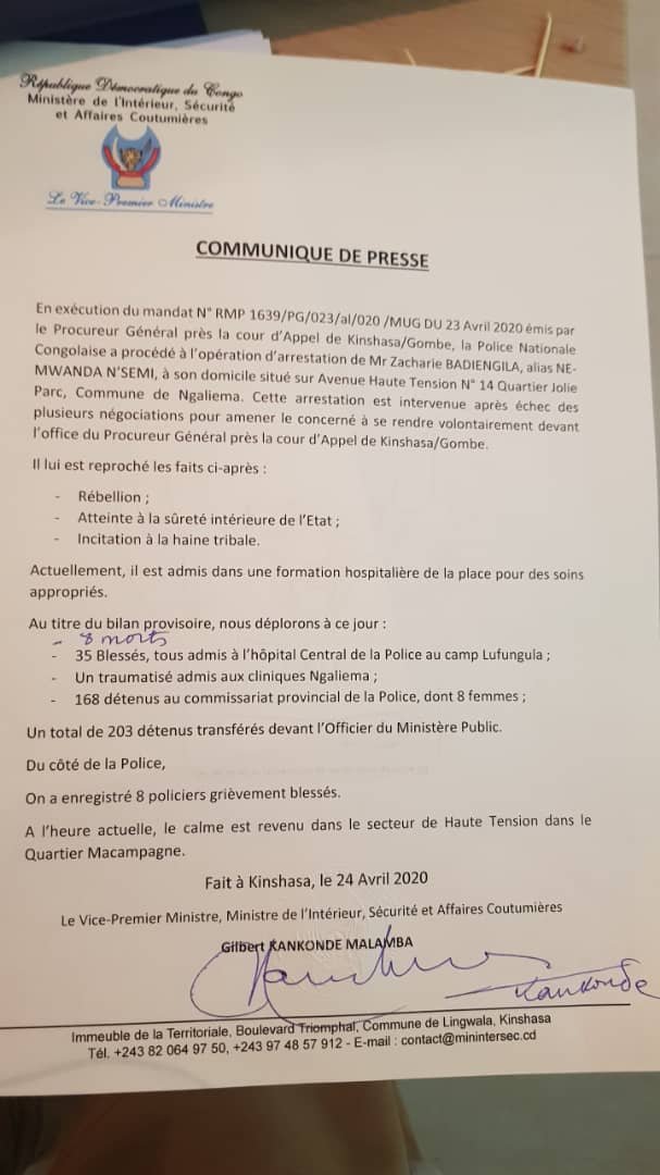 Le ministre de l’Intérieur, Gilbert Kankonde, a dressé un bilan de 8 morts, 35 blessés, un traumatisé admis aux Cliniques Ngaliema, 203 détenus transférés devant l’Officier du Ministère Public et 8 policiers et 168 détenus au commissariat provincial de la Police, dont 8 femmes.
