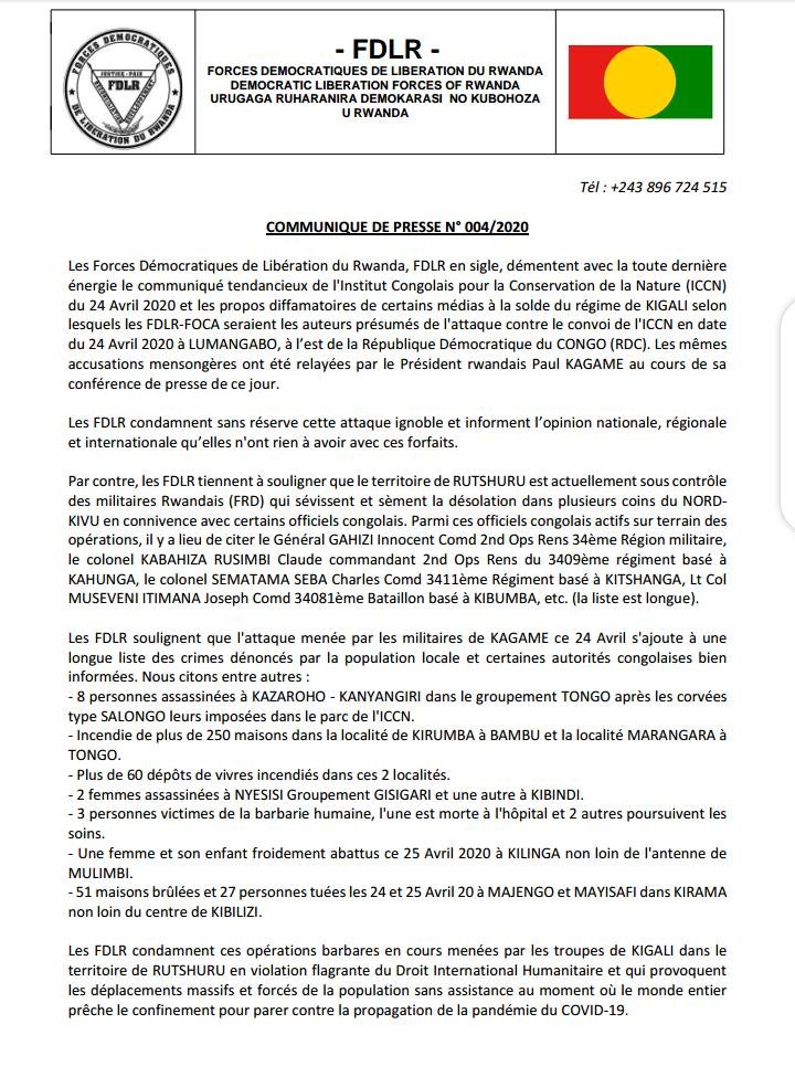 Dans un communiqué rendu public ce lundi 27 avril, les éléments des Forces Démocratiques de Libération du Rwanda (FDLR) rejettent les accusations portées à leur égard, relatives à la dernière attaque du convoi de l’Institut Congolais pour la conservation de la Nature (ICCN) à Lumangabo sur la route Goma-Rutshuru, laquelle attaque a fait 17 morts dont 12 éco gardes.