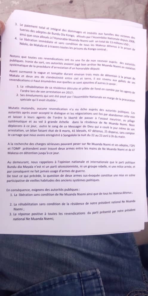 Par ailleurs, BDM rassure au Chef de l’État, Félix Tshisekedi, son soutien et du peuple Kongo dans la mesure où ses revendications trouveront satisfaction.