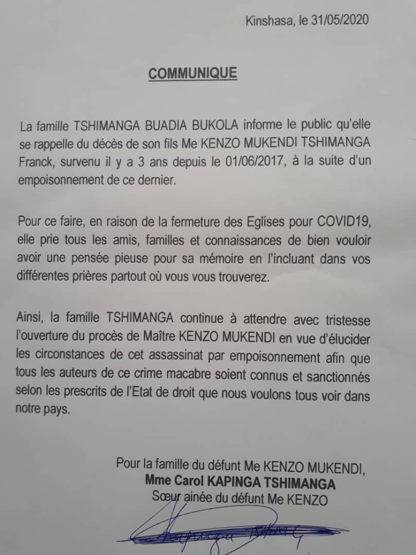 Dans un communiqué lundi 01 juin, la famille biologique de l’ancien secrétaire général de la Fédération Congolaise de Taekwondo, Me Kenzo Mukendi, a évoqué la thèse d’un empoisonnement et exige l’ouverture d’une enquête 3 ans après sa disparition inopinée.