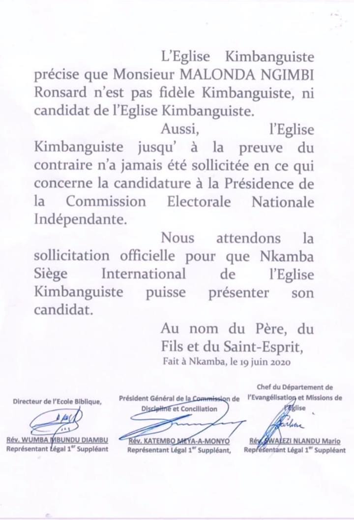 Dans le même communiqué, le Saint-Siège coupe court aux spéculations selon lesquelles Monsieur Ronsard Malonda serait son candidat à la CENI. Et de préciser que le précité n’est pas fidèle Kimbanguiste et ne peut donc pas par conséquent être candidat de cette communauté à la présidence de la centrale électorale.
