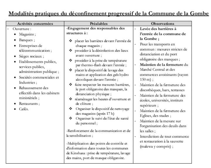 Selon le compte-rendu de cette rencontre lu par le ministre de la Communication et Médias, Jolinot Makelele, ce déconfinement sera « progressif » dont en voici quelques modalités :