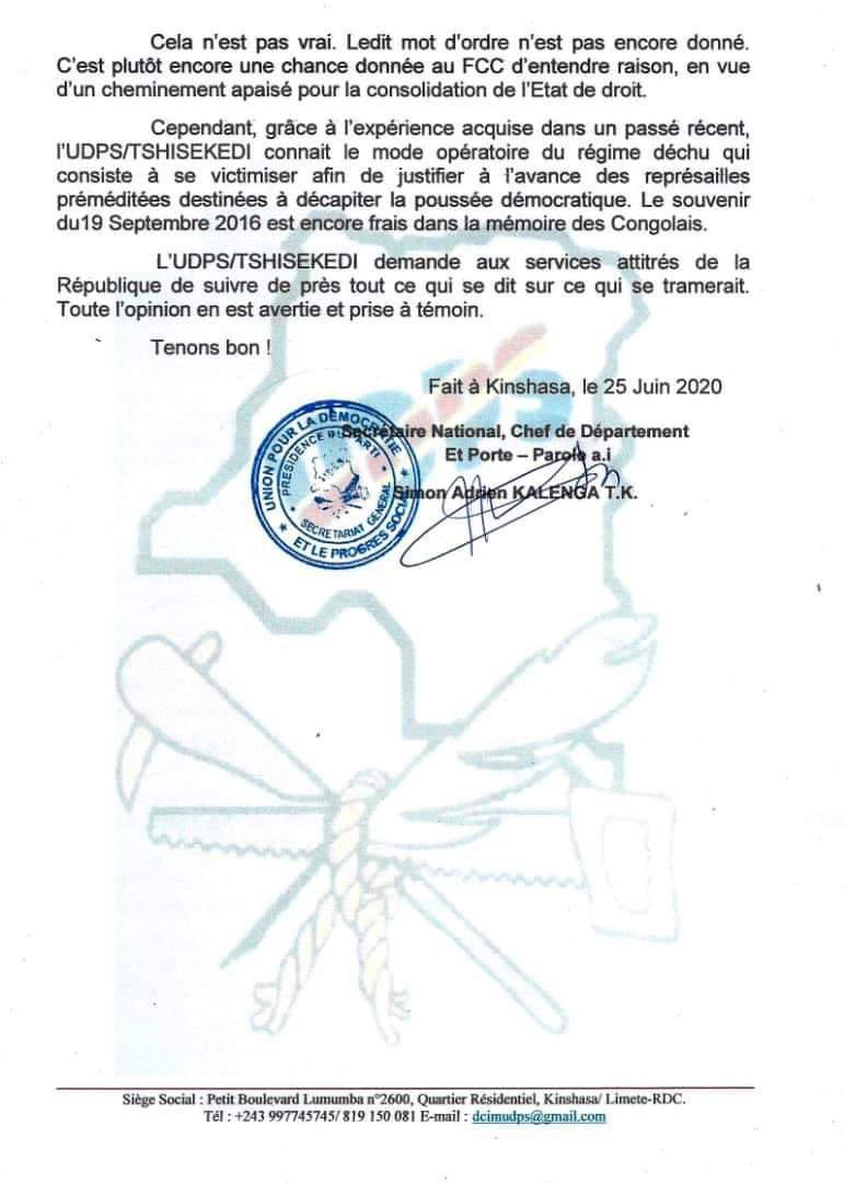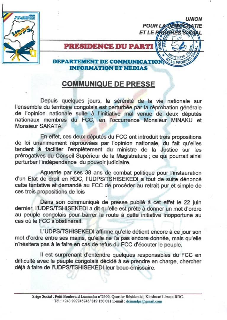 Dans une déclaration faite jeudi 25 juin, l’Union pour la Démocratie et le Progrès Social (UDPS) a promis de donner un mot d’ordre à ses militants en cas d’un refus de la proposition de loi déposée par les députés nationaux Aubin Minaku et Garry Sakata sur la réforme de l’appareil judiciaire.