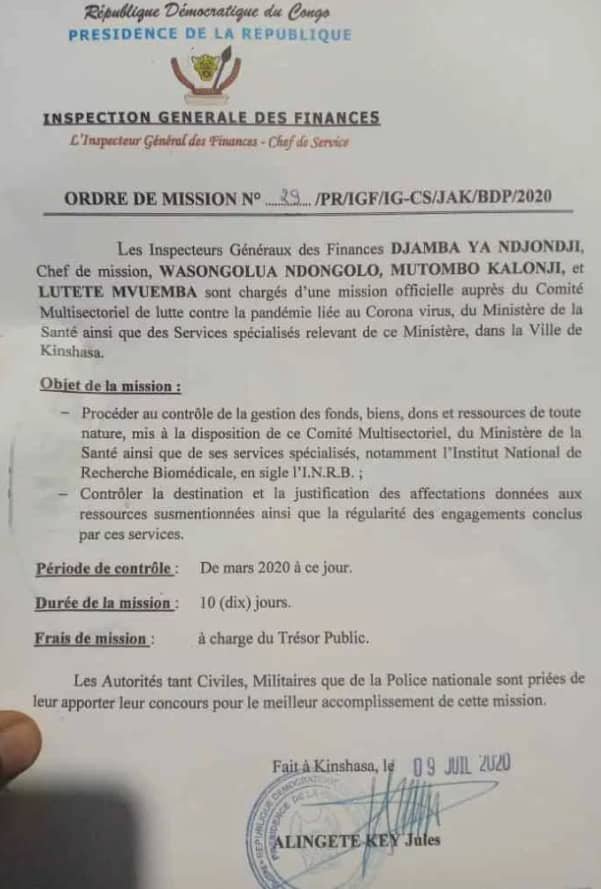 Dans un communiqué publié 09 juillet, l’Inspection Générale de Finances (IGF) a diligenté une mission de contrôle quant à l’utilisation de fonds alloués pour la riposte contre la pandémie du nouveau Coronavirus (COVID-19) en Rd-Congo.