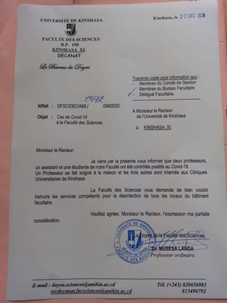 » Monsieur le recteur, je viens par la présente vous informer que deux professeurs, un assistant et une étudiante de notre Faculté ont été contrôlés positifs à la Covid-19. Un professeur se fait soigner à la maison et les trois autres sont internés aux Cliniques universitaires de Kinshasa« , peut-on lire dans le document écrit par le doyen de la Faculté des Sciences.