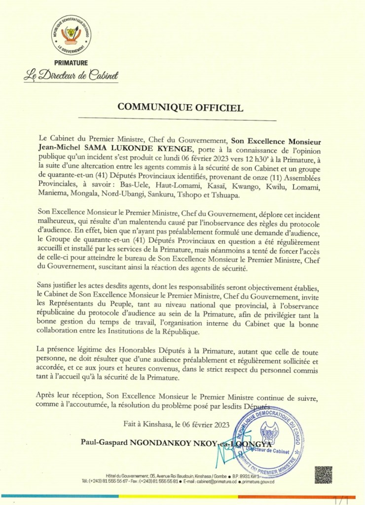 Après l’incident de ce lundi 6 février 2023 vers midi dans les installations de la Primature, suscité par un accrochage entre un groupe des députés provinciaux et les services de sécurité de la Primature, le directeur de cabinet du Premier ministre, Paul Gaspard Ngondankoy Nkoy-ea-Longya, a réuni ces élus de province pour échanger avec eux sur leurs revendications portant sur le paiement des arriérés de leurs émoluments.